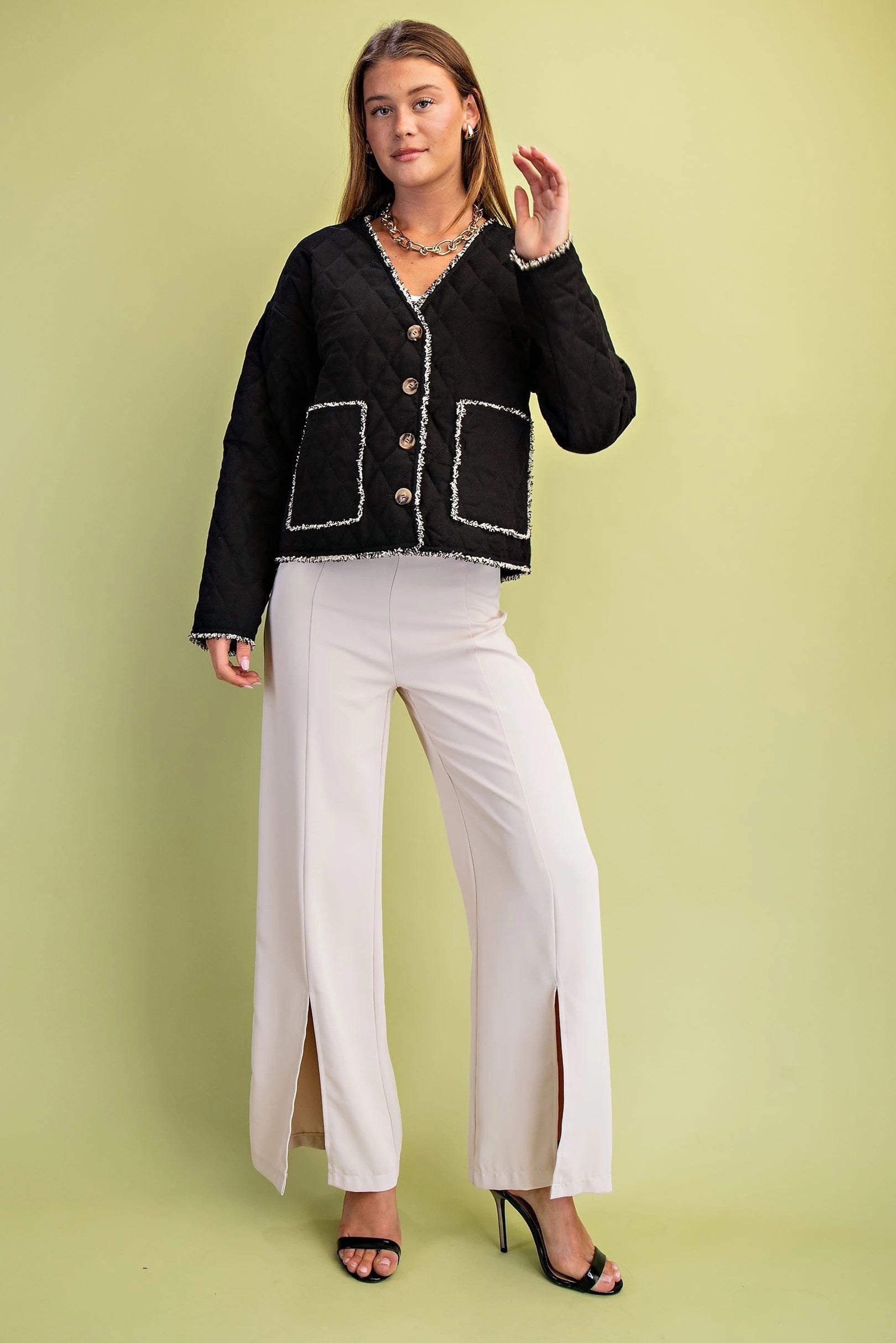 The Jackie Kay Quilted Jacket combines bold sophistication with standout style. Featuring textured quilting and edgy frayed fringe details, this button-up jacket commands attention while offering practical front patch pockets. Perfect for those who dare to defy the ordinary, it elevates any outfit with its confident charm and unique accents.