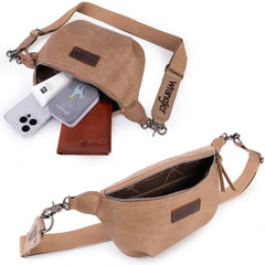 Carry your essentials with edge. This Wrangler fanny pack transforms from crossbody to sling to belt bag—whatever your adventure demands. The adjustable, detachable canvas strap gives you four ways to wear it, while the iconic Wrangler logo signals timeless style. Secure top zipper, rear zippered pocket, and interior card slots keep your gear organized. Dimensions: 10.5" x 2.75" x 7.5" with a 23" drop. Unisex design, unlimited versatility.